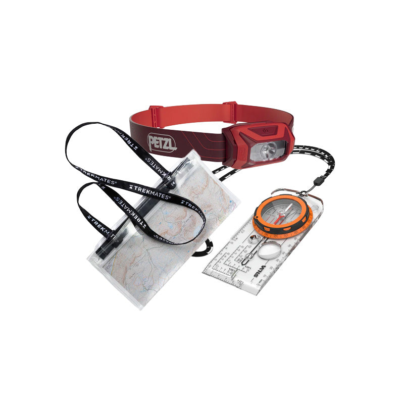 De Navigatie Bundel combineert drie essentials voor avonturiers die niet willen verdwalen: het uiterst nauwkeurige Silva Expedition kompas, de waterdichte Trekmates kaartenhoes en de betrouwbare Petzl Tikkina hoofdlamp (ook verkrijgbaar in groen).